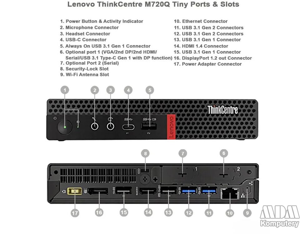 Wszechstronny i praktycznyDzięki eleganckiej obudowie ThinkCentre M720q idealnie pasuje do każdego nowoczesnego miejsca pracy – niezależnie od tego, czy jest to biuro, placówka służby zdrowia czy sklep detaliczny. Urządzenie może też znajdować się w dowolnym miejscu – na biurku lub pionowej podstawie ThinkCentre. Możesz je również podłączyć do monitora i włączyć komputer za pomocą prostego skrótu klawiszowego.